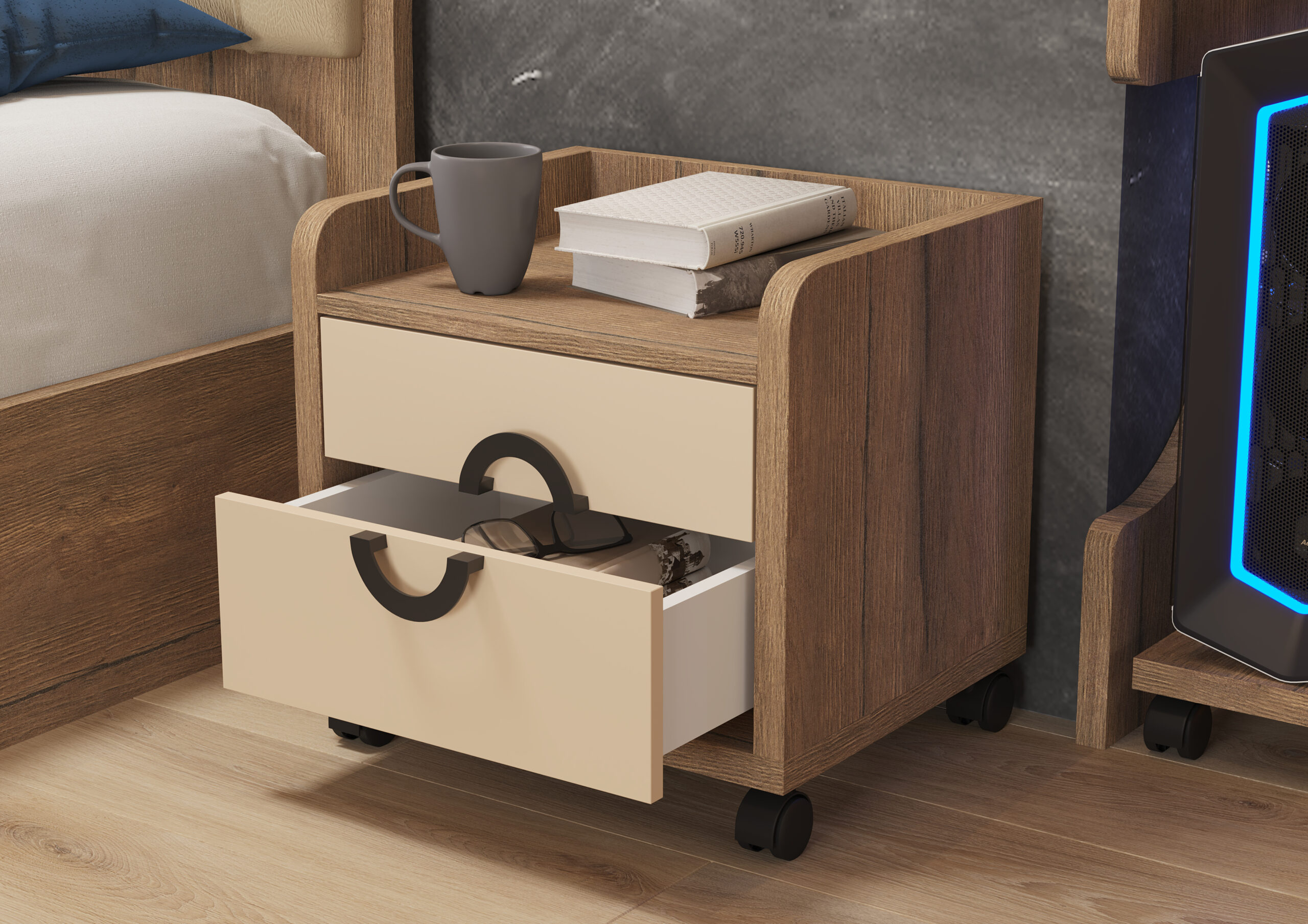 שידה ליד המיטה: גובה 50 ס”מ , רוחב 55 ס”מ , עומק 40 ס”מ.