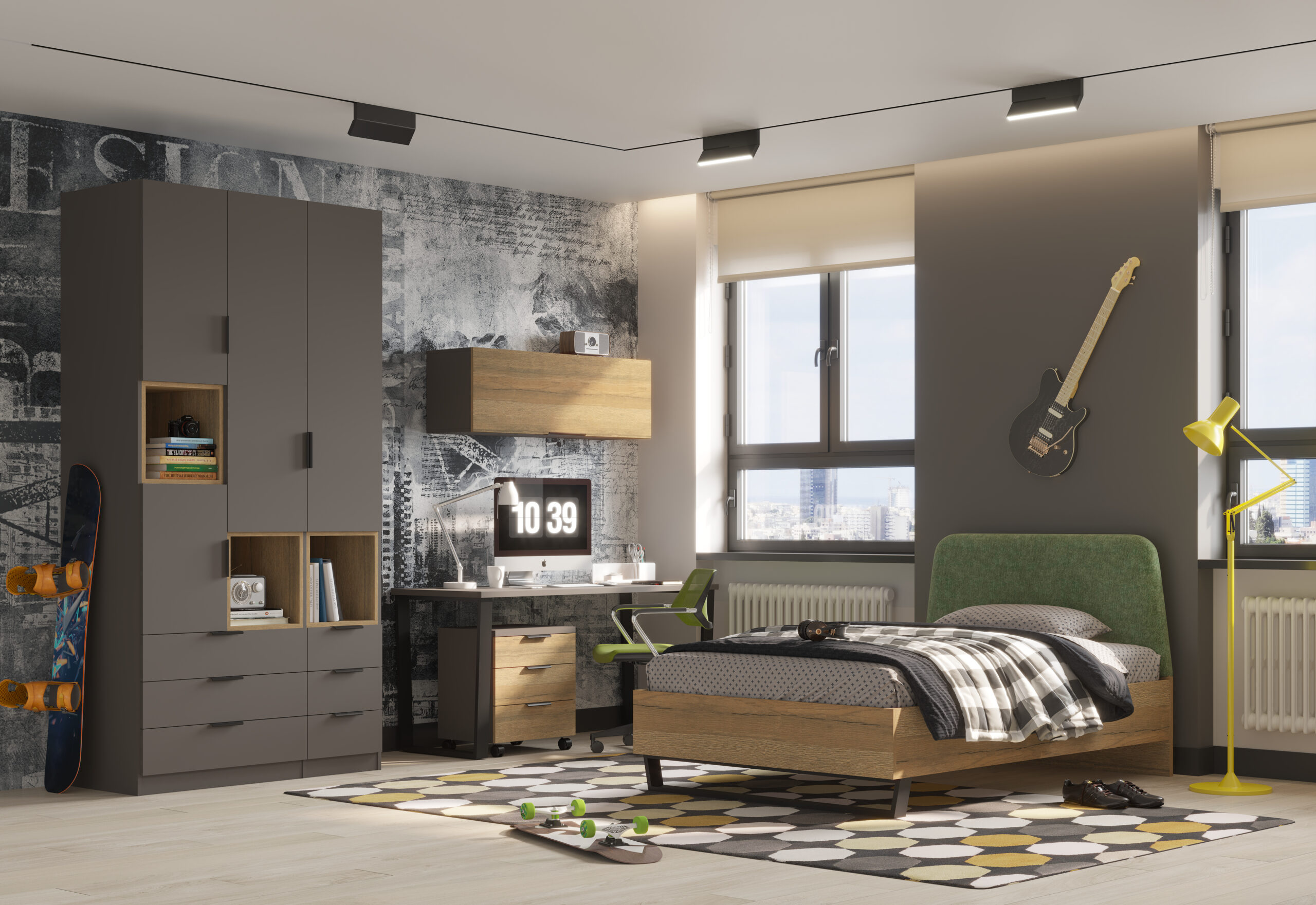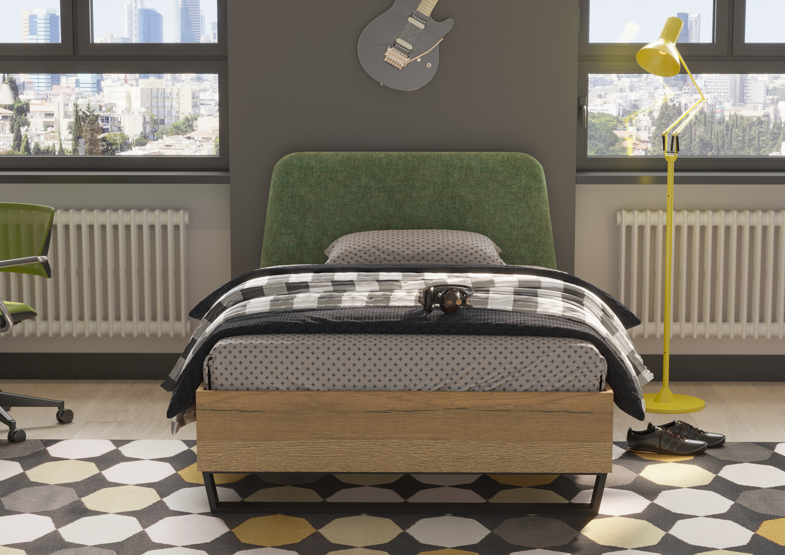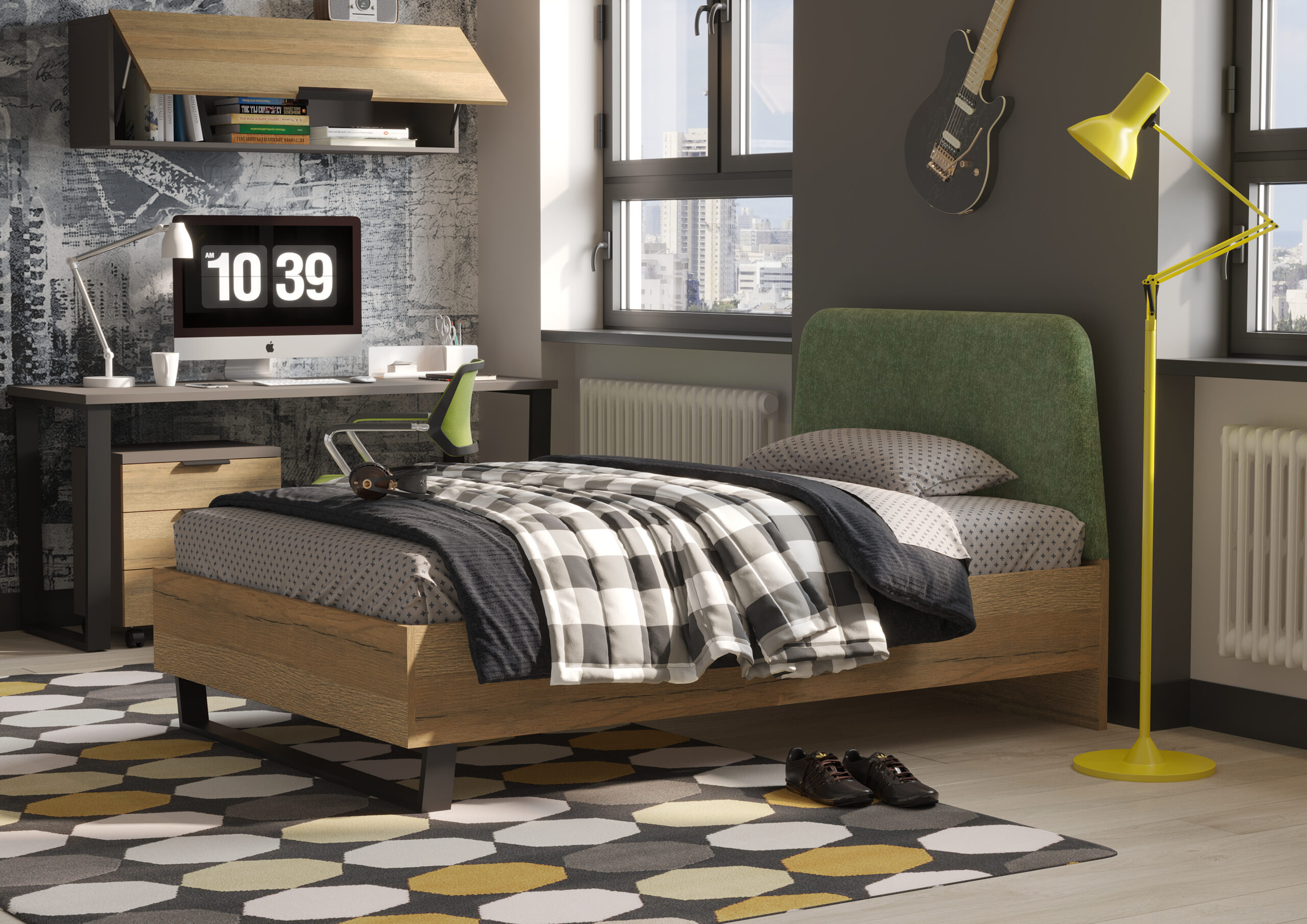 מיטה: גובה ראש מיטה 100 ס”מ , רוחב 90 ס”מ , אורך 197 ס”מ – מותאם למידת מזרן 80*190 ס”מ.