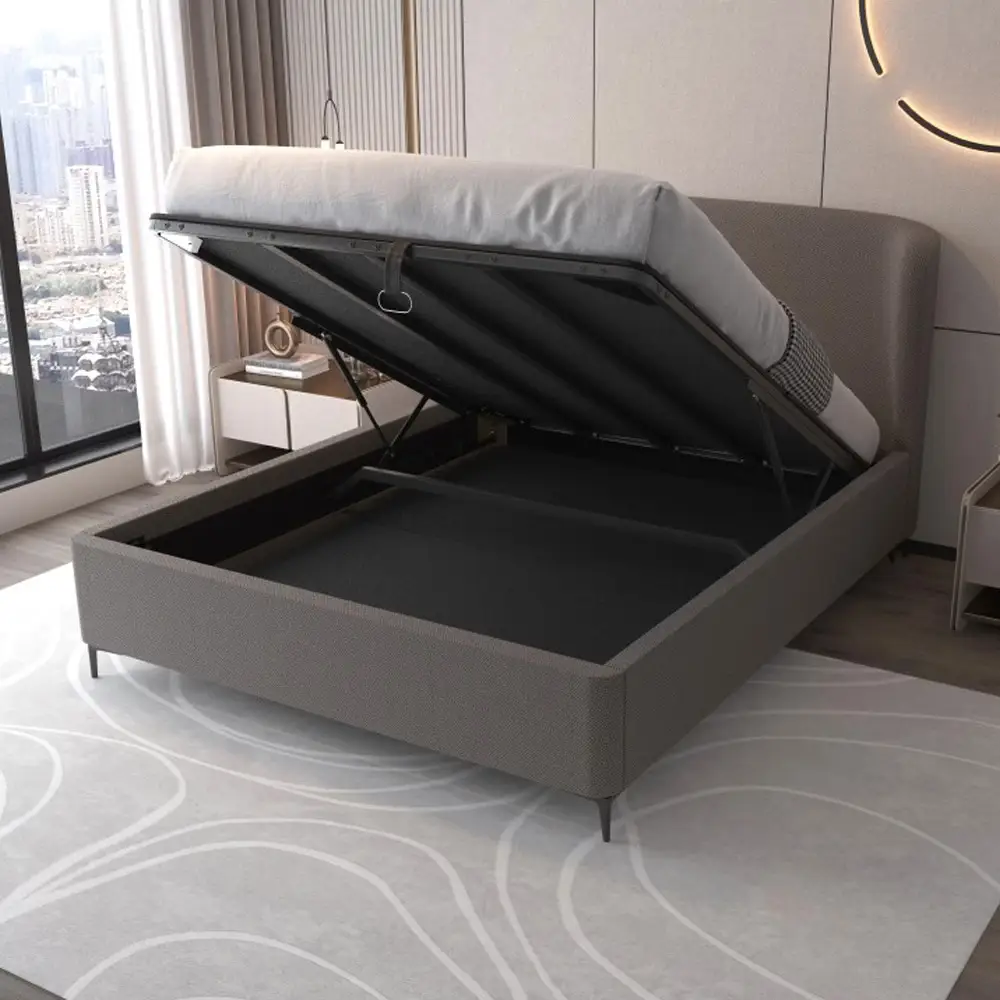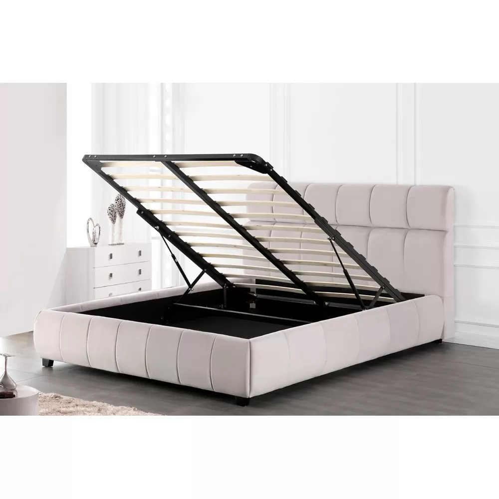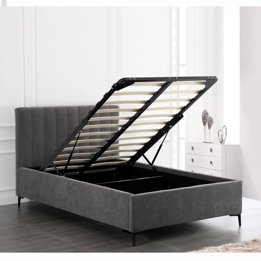 ארגז מצעים מובנה, מרווח, מתרומם מחזית המיטה, עם מנגנוני בוכנות להרמה קלה ונוחה כמוצג בתצלום.