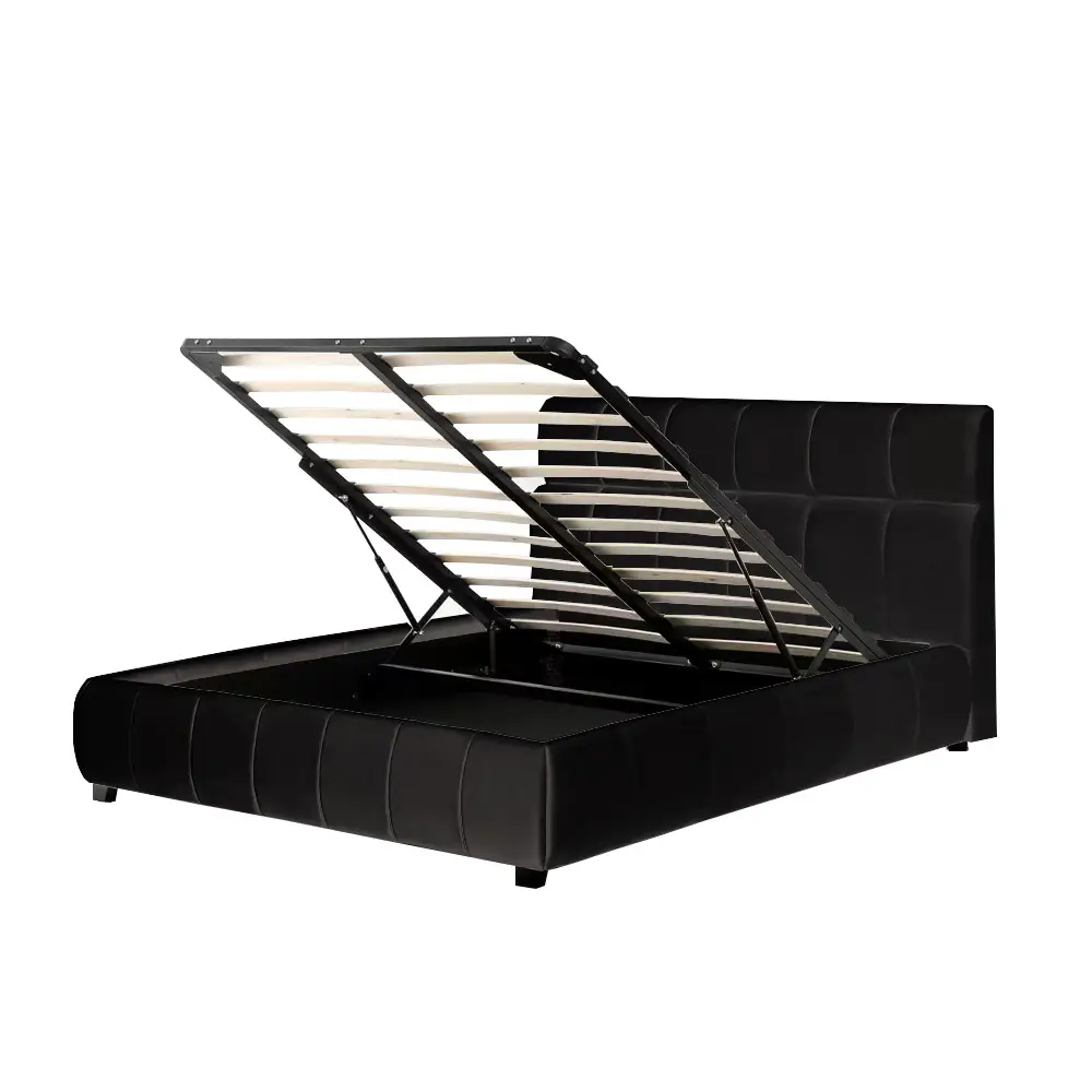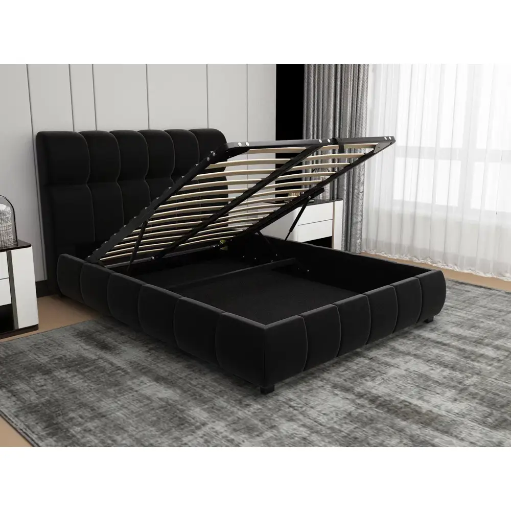 ארגז מצעים מובנה, מרווח, מתרומם מחזית המיטה, עם מנגנוני בוכנות להרמה קלה ונוחה כמוצג בתצלום.