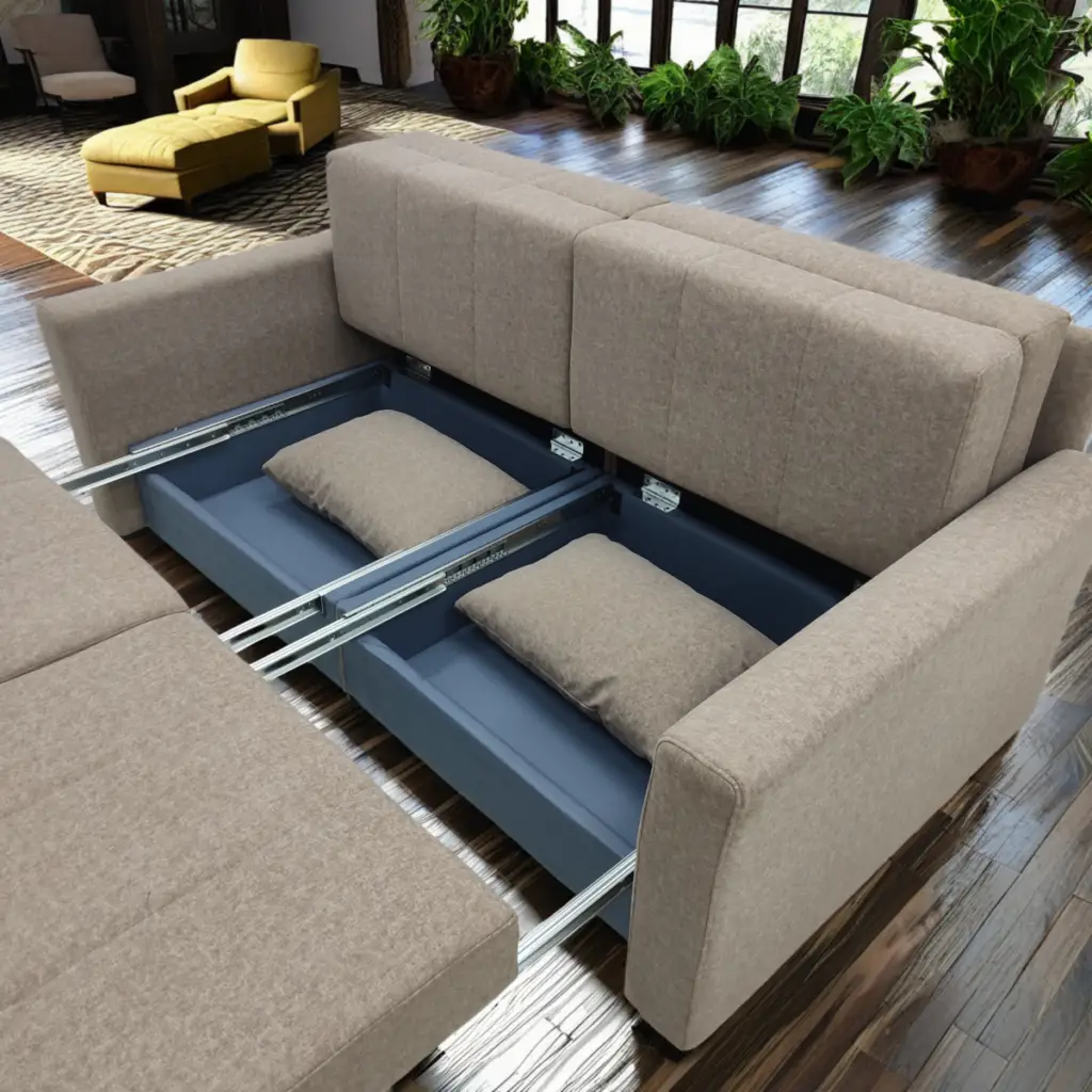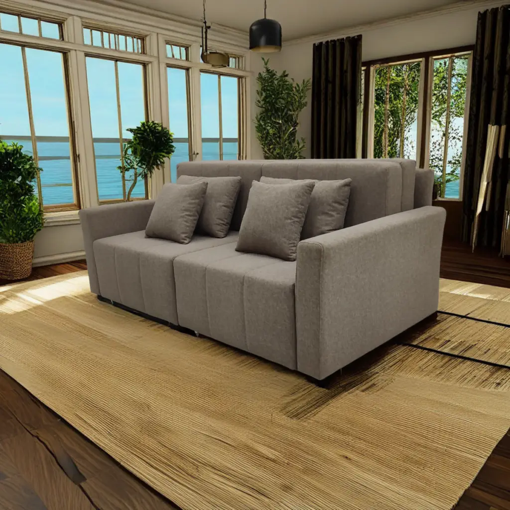 הספה מכילה ארגז מצעים, ומגיעה עם כריות נוי.